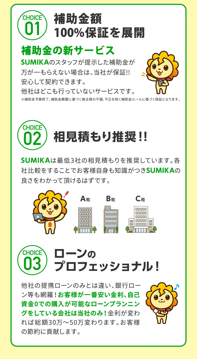 A.当社自体で3年ごとの定期メンテナンス・商品自体には15年から20年の保証がついております。自然災害時の火災保険の使い方等もアドバイスさせていただいておりますので、20年間は安心して使える環境を整えております。